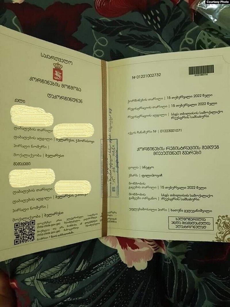 «Мы даведваліся пра суседнюю Чэхію — усё адно патрэбная даведка з ЗАГСу ў Беларусі. А ў Грузіі ўсе працэдуры максымальна спрошчаныя. Каб іншаземцу ўступіць у шлюб, ня трэба нічога, акрамя пашпарту. Пашпарт неабходна перакласьці на грузінскую мову, патрэбныя яшчэ двое сьведак. Калі гэта грамадзяне Грузіі, яны проста прыходзяць з сваімі пашпартамі, калі грамадзяне іншых краінаў, у тым ліку беларусы, якія адмыслова прыехалі ці жывуць у Грузіі, — неабходныя пераклады іхных пашпартоў. І ў прынцыпе ўсё — зь перакладзенымі пашпартамі можна ісьці ў грузінскі ЗАГС», — тлумачыць Наста.