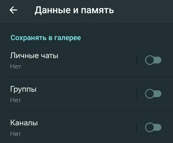 У Telegram заходзім у «Налады» — «Дадзеныя і памяць». Адключаем ўсе бегункі ў раздзеле «Захоўваць у галерэі» (як на скрыншоце).