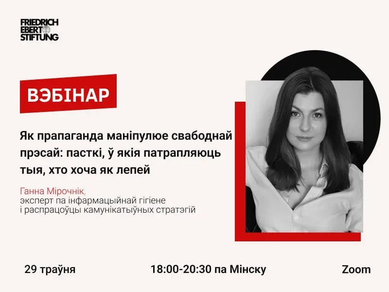 Вэбінар «Як прапаганда маніпулюе свабоднай прэсай: пасткі, у якія патрапляюць тыя, хто хоча як лепей» ад медыяаналітыка Ганны Мірочнік (рэгістрацыя да 28 траўня)