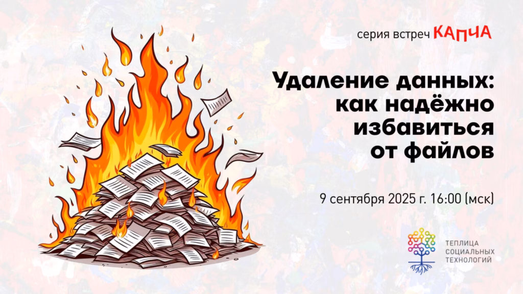 Цяпліца сацыяльных тэхналогій правядзе інтэрактыўную сустрэчу «Выдаленне дадзеных: як надзейна пазбавіцца ад файлаў». Мерапрыемства адрасавана грамадзянскім актывістам, журналістам, валанцёрам і ўсім, хто занепакоены пытаннямі лічбавай бяспекі.
