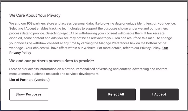 Всплывающее окно с вопросом, согласны ли вы принимать файлы cookie. Скриншот с сайта pcmag.com
