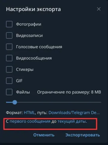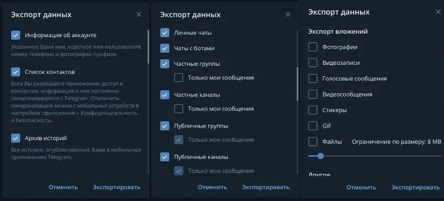 Стоит понимать, что силовики делают полный экспорт аккаунта. Чтобы увидеть всю информацию, которую хранит о вас Telegram, выбирайте все пункты. В экспорте вложений можно выбрать максимальный размер файлов.
