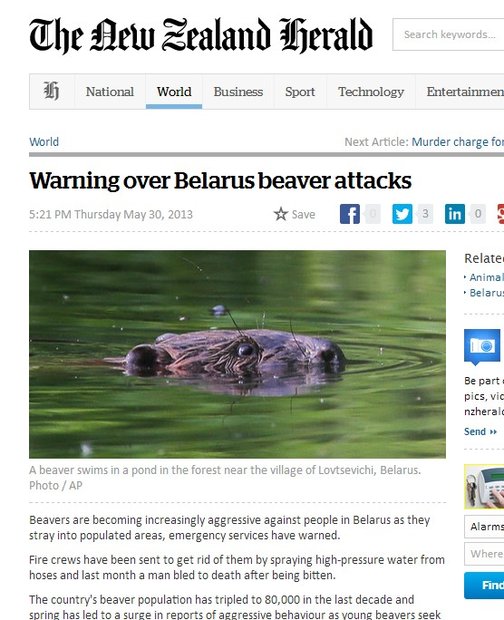По непонятно откуда взявшейся у новозеландцев информации, «Бобры в Беларуси становятся все более агрессивны, об этом предупреждают местные службы по чрезвычайным ситуациям». Кроме того, как выяснилось, белорусские власти уже «высылали бригады пожарных, чтобы избавиться от бобров при помощи брандспойтов».