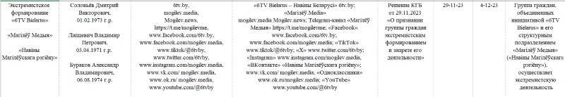 У пералік «экстрэмісцкіх фармаванняў» на сайце Міністэрства ўнутраных спраў Беларусі ўключаныя рэгіянальныя медыярэсурсы: YouTube-канал 6TV Bielarus, інфармацыйны сайт «Магілёў. Media» («Навіны Магілёўскага рэгіёну»), а таксама іх шматлікія акаўнты ў сацыяльных сетках і месенджарах.