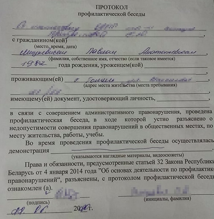 В конце беседы с гомельским собкором сотрудница милиции составила протокол профилактической беседы, под которым предложила журналисту расписаться.
