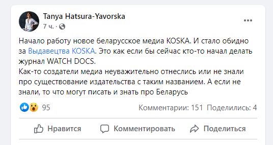Учора было заяўлена пра старт новага медыя пра рэгіёны Беларусі – Koska.media. Але ў першыя ж суткі чытачы заўважылі, што назва медыя супадае з назвай вядомага беларускага выдавецтва, да якога рэсурс не мае дачынення.