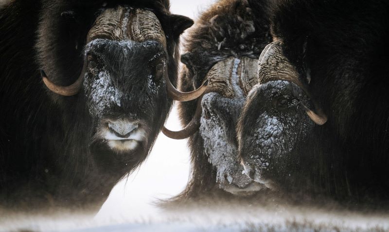 «Мушкетеры», шорт-лист в категории «Живой мир и дикая природа». «Портрет крупным планом трех самцов-овцебыков, снятый во время снежной бури. Овцебык прекрасно приспособлен к холодным условиям и покрыт слоем гивиута — пуха, теплого, как кашемир, — и темным мехом длиной около 50 сантиметров». Фото: Chris Schmid / Sony World Photography Awards 2024