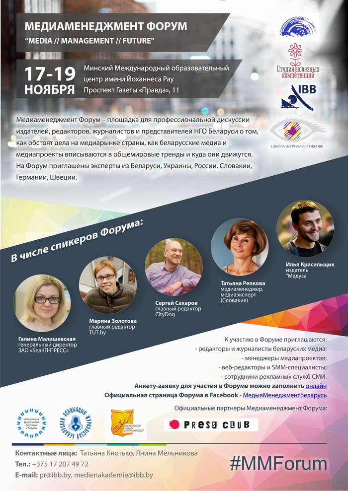 Медиаменеджмент Форум "Media // Management // Future"пройдет в стенах Минского международного образовательного центра (ММОЦ) имени Йоханнеса Рау 17-19 ноября 2016 года. Его организаторами выступают Школа журналистики ММОЦ и учреждение «Центр дополнительного образования взрослых «Студия полезных компетенций» (Гродно) в партнерстве с Deutsche Welle Akademie (Берлин).