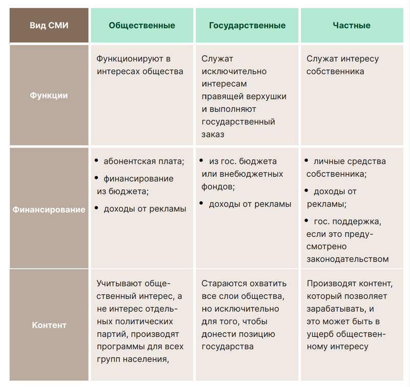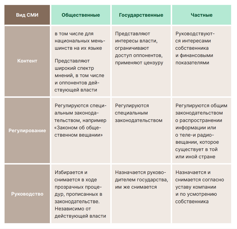 Ниже в таблице приведены основные отличия между общественными, государственными и частными СМИ: