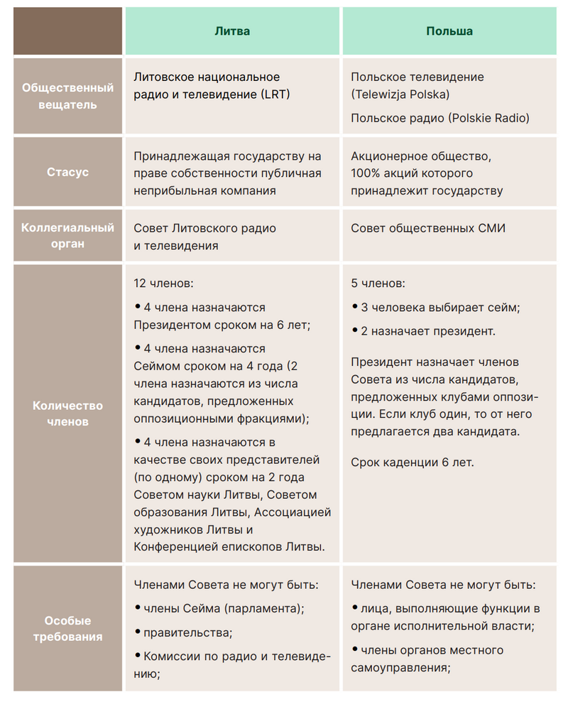 В Польше в Совет по радио и телевидению состоит из пяти членов: по два назначают Сейм и президент, и одного — Сенат.