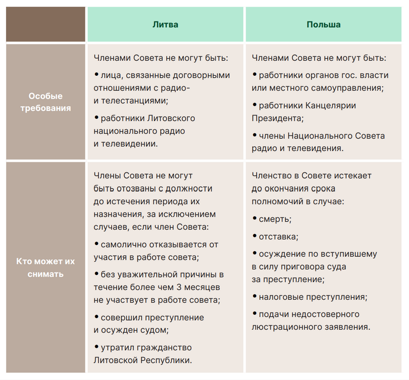 Например, в Литве Комиссия по радио и телевидению состоит из 12 членов: одного назначает Президент, троих — Сейм по представлению Комитета по образованию, науке и культуре, по одному члену — Союз художников Литвы, Союз кинематографистов Литвы, Союз композиторов Литвы, Союз писателей Литвы, Театральный союз Литвы, Союз журналистов Литвы, Общество журналистов Литвы, Ассоциация издателей периодической печати Литвы.