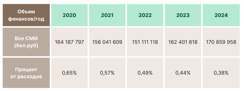 В республиканском бюджете на 2023 год на средства массовой информации была заложена сумма в размере 162 миллионов 401 тысячи 818,0 рублей, что составило 0,44% от суммы всех планируемых расходов (около 59 миллионов 349 тысяч в долларовом эквиваленте по курсу Национального банка Республики Беларусь на начало года). Большая часть средств была заложена на телевидение и радиовещание — 133 591 999,0 рублей. В 2022 году на все виды СМИ в бюджете выделялось 151 111 118,0 рублей (0,49% от суммы всех планируемых расходов или около 59 миллионов 303 тысяч в долларовом эквиваленте по курсу Национального банка Республики Беларусь на начало года), в 2021 году — 156 041 609,0 рублей (0,57% от суммы всех планируемых расходов или около 60 миллионов 507 тысяч в долларовом эквиваленте по курсу Национального банка Республики Беларусь на начало года), в 2020 году — 164 187 797,0 рублей (0,65% от суммы всех планируемых расходов или около 77 миллионов 869 тысяч в долларовом эквиваленте по курсу Национального банка Республики Беларусь на начало года).