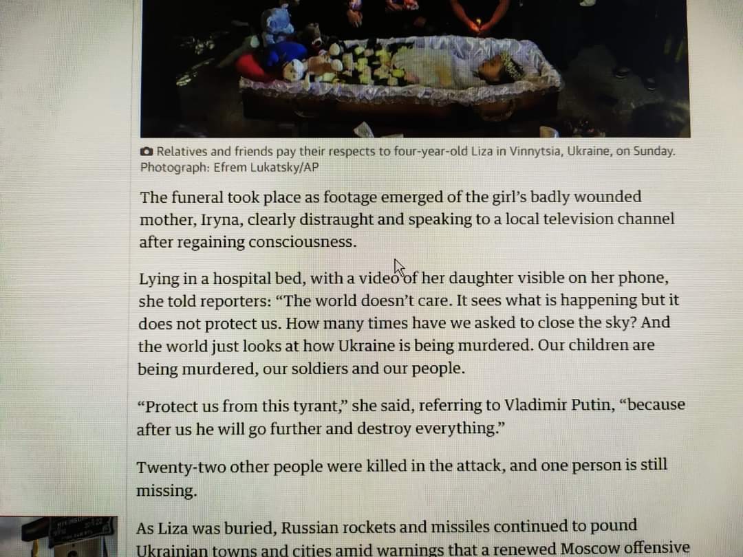 14 июля российская ракета в Виннице убила четырехлетнюю Лизу Дмитриеву и тяжело травмировала ее маму — дизайнера издательского дома «Картель» Ирину Дмитриеву. Когда Ирина очнулась, ей сначала не сообщали о гибели дочери, ведь врачи говорили, что это может убить женщину.