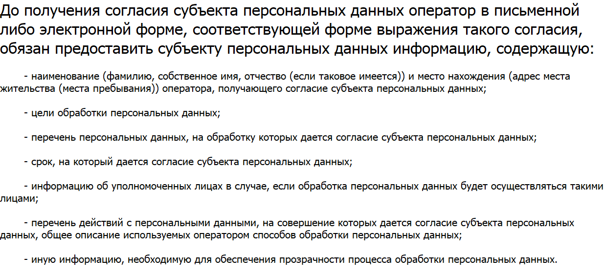 Закон предписывает: до получения согласия субъекта персональных данных оператор обязан простым и ясным языком разъяснить субъекту персональных данных его права, связанные с обработкой персональных данных, механизм реализации таких прав, а также последствия дачи согласия субъекта персональных данных или отказа в даче такого согласия. Эта информация должна быть предоставлена оператором субъекту персональных данных в письменной либо электронной форме, соответствующей форме выражения его согласия, отдельно от иной предоставляемой ему информации.