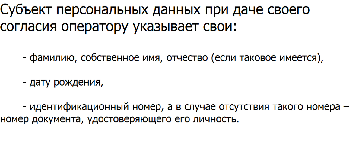 Если цели обработки персональных данных не требуют обработки информации, указанной на иллюстрации 12, эта информация не подлежит обработке оператором при получении согласия субъекта персональных данных. Так как обработка персональных данных состоит в том числе в их сборе, это означает, что фамилия, имя, отчество, дата рождения, идентификационный номер в указанном случае не запрашиваются.