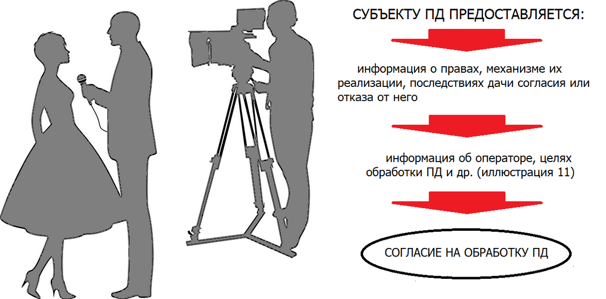 До начала интервью (записи разговора, опроса, беседы и т.д.) опрашиваемому простым и ясным языком излагается информация о его правах (иллюстрация 14), механизме их реализации (изучаем содержание ст.ст. 10 – 14), последствиях дачи согласия или отказа от него. Форма изложения этой информации предопределена Законом: «в письменной либо электронной форме, соответствующей форме выражения его согласия, отдельно от иной предоставляемой ему информации». Например, если согласие гражданином будет выражено письменно, то и вышеуказанная информация должна быть изложена в письменном виде, в виде отдельного документа.