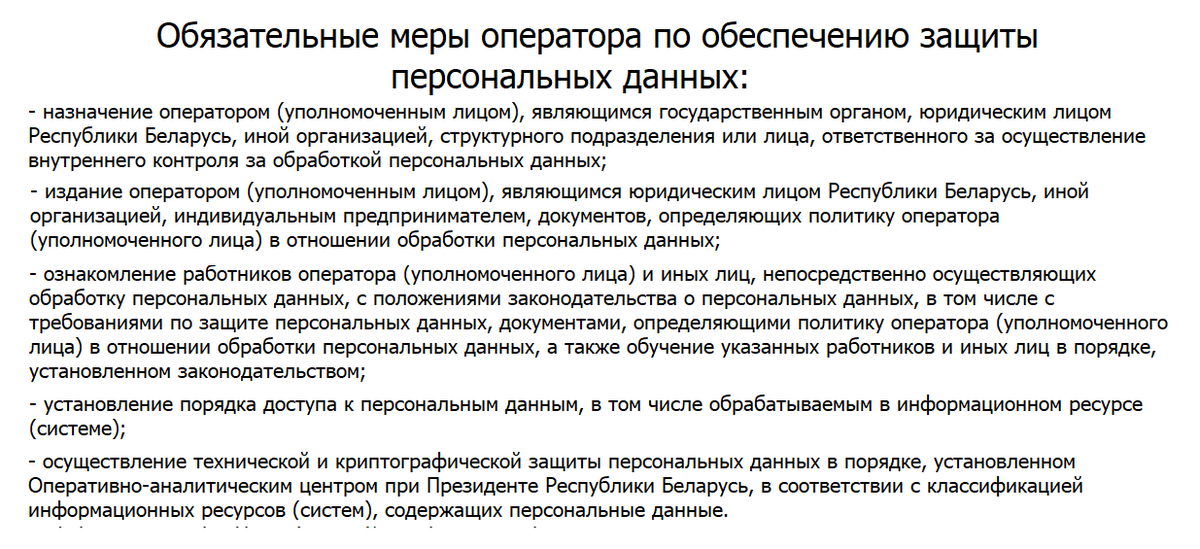 - определять состав и перечень мер, необходимых и достаточных для выполнения обязанностей по обеспечению защиты персональных данных, с учетом требований Закона и иных актов законодательства.