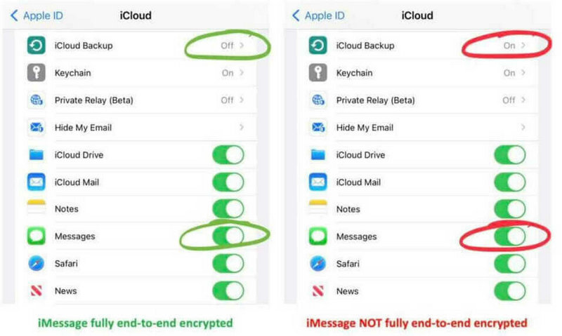 Яшчэ адзін цікавы момант з ключамі шыфравання. Па змоўчанні яны перадаюцца ў iCloud, што робіць скразное шыфраванне фактычна бессэнсоўным, бо кампанія можа іх перадаць каму заўгодна. Эксперты раяць адключаць захаванне паведамленняў iMessages у iCloud Backup ці ўвогуле адключыць яго, каб прадухіліць такую магчымасць.