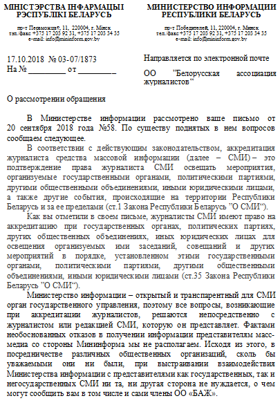 “У пасярэдніцтве розных грамадскіх арганізацый, якімі б паважанымі яны ні былі, пры выбудоўванні ўзаемадзеяння Міністэрства інфармацыі з прадстаўнікамі як дзяржаўных, так і недзяржаўных СМІ ні той, ні іншы бок не маюць патрэбы, пра што могуць паведаміць вам у тым ліку і самі сябры ГА “БАЖ”. Жадаем поспехаў на ніве грамадскай дзейнасці, калі такія прынясуць карысць краіне”.