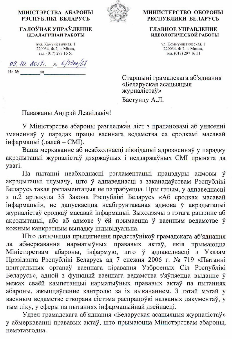 У верасні ГА “Беларуская асацыяцыя журналістаў” звярталася у Міністэрства абароны з просьбай скасаваць дыскрымінацыйны падыход пры акрэдытацыі журналістаў дзяржаўных і недзяржаўных СМІ.