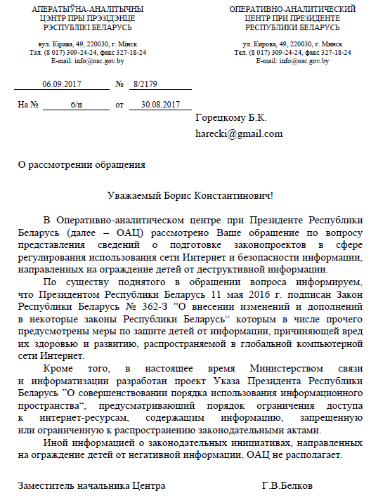 У адказе за подпісам Генадзя Бялкова гаворыцца, што Міністэрствам сувязі і інфарматызацыі распрацаваны праект Указа Прэзідэнта Рэспублікі Беларусь “Аб удасканаленні парадку выкарыстання інфармацыйнай прасторы”, які прадугледжвае парадак абмежавання доступу да інтэрнэт-рэсурсаў, якія змяшчаюць інфармацыю, забароненую або абмежаваную да распаўсюджвання заканадаўчымі актамі.