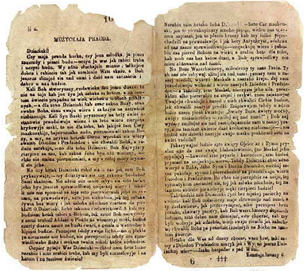Цяпер пытаю вас, дзецюкі, — хто ж нам гэта ліха нарабіў і што зрабіць трэба, каб мы былі шчаслівыя і на гэтам, і на тым свеце? Нарабіў нам гэтага ліха, дзецюкі, цар маскоўскі, ён, перакупіўшы многа папоў, вялеў нас у схізму запісаць, ён плаціў грошы, каб толькі пераходзілі на праваслаўе, і адабраў ад нас нашу справядлівую ўніяцкую веру і пагубіў нас перад Богам навекі; а зрабіў гэта для таго, каб мог нас без канца драці, а Бог справядлівы не меў злітавання над намі”, — адзначалася ў шостым нумары выдання.