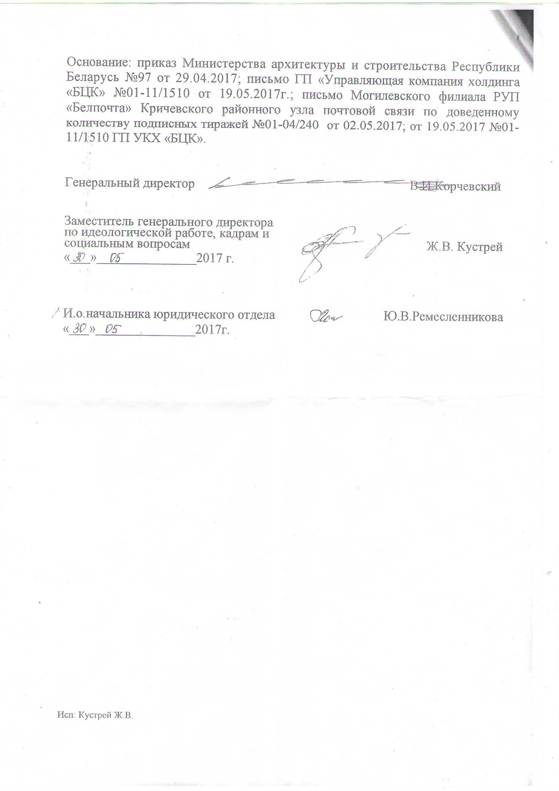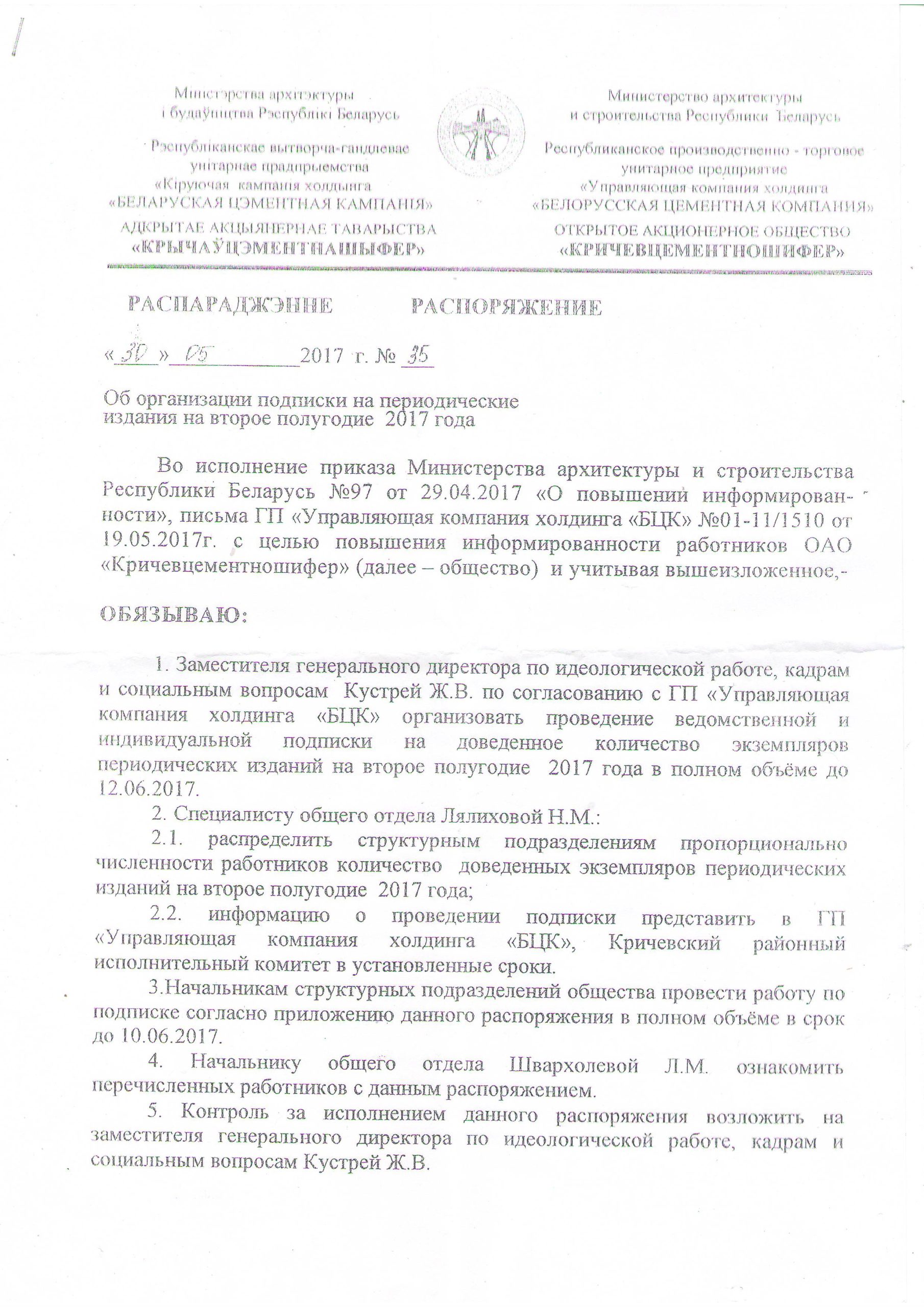 Распараджэнне аб арганізацыі падпіскі на другое паўгоддзе 2017 года за подпісам генеральнага дырэктара ААТ “Крычаўцэменташыфер” В. Карчэўскага журналістам крычаўскай незалежнай газеты “Вольны горад” перадалі работнікі прадпрыемства.