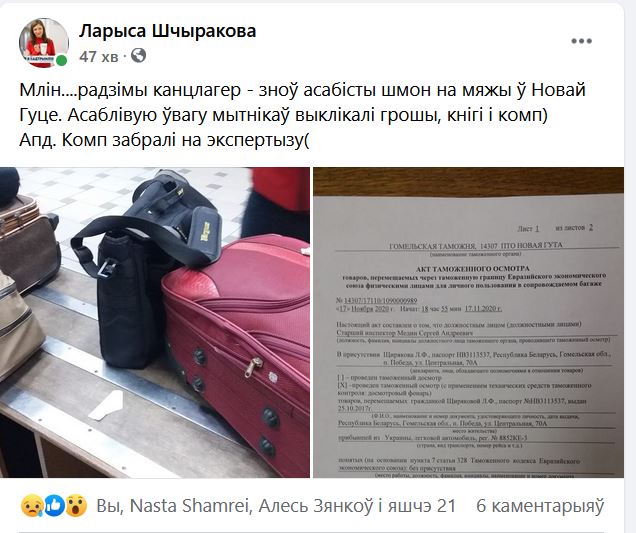 «На памежным пераходзе «Новая Гута» з нашай групы асабістыя рэчы даглядалі надзвычай уважліва толькі ў мяне. Убачыўшы ноўтбук, інспектар запытаўся, чый ён. Я адказала, што мой. Склалі акт вынятку і забралі ноўтбук для праверкі — на цэлых 20 дзён. Пасля паездкі я мушу дзесяць дзён быць на самаізаляцыі. Аднак мне няма на чым працаваць», — паведаміла карэспандэнту службы маніторынгу ГА «БАЖ» Шчыракова.