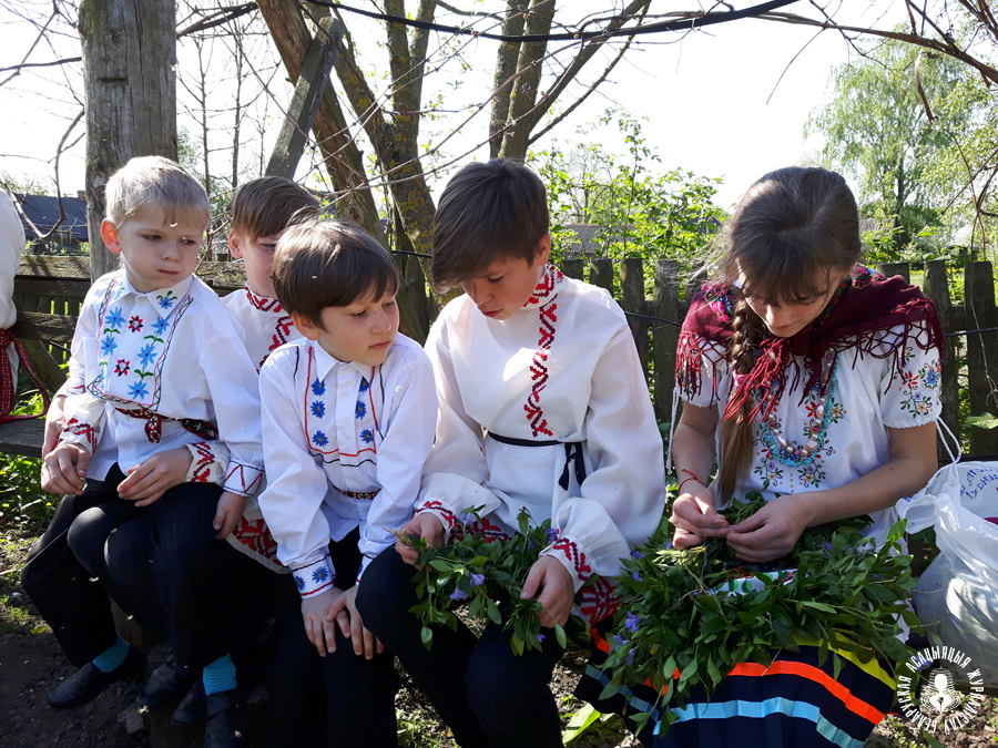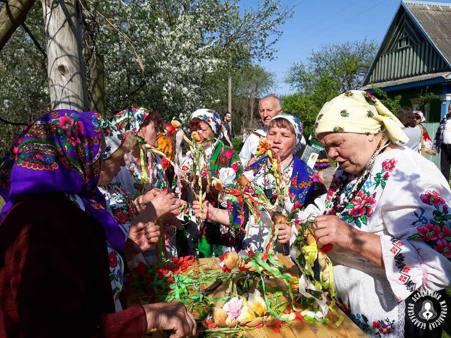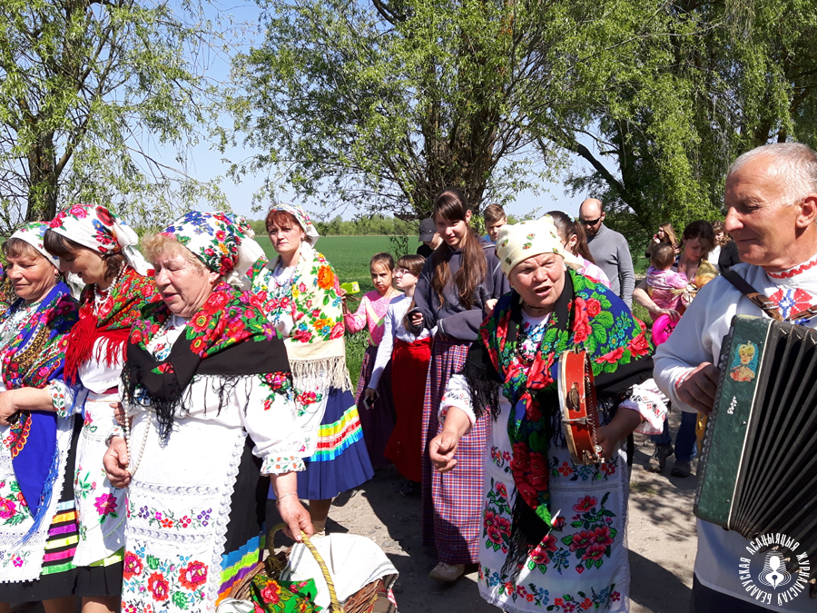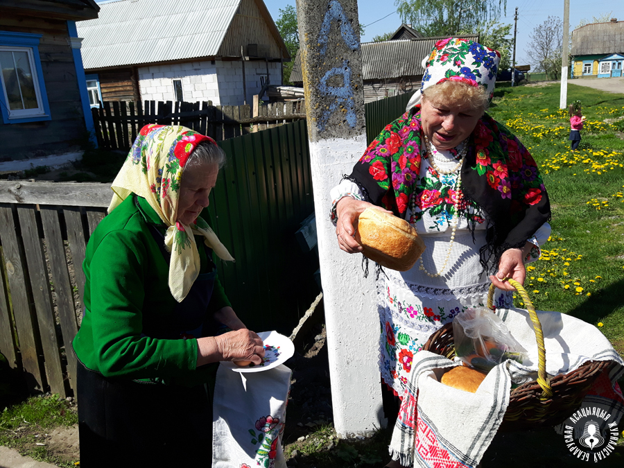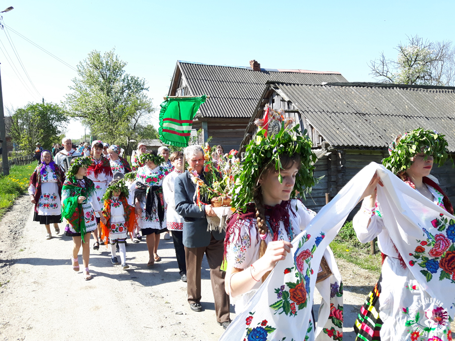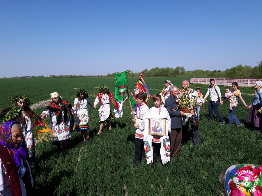 “А дзявятай ні на пачатку дзесятай гадзіны, — працягвае Кацярына Аляксееўна. — Усе разам выпраўляемся праз вёску ў поле. Наперадзе дзяўчаткі нясуць ручнік з узнятай сярэдзінай — “царскаю брамай”. За вёскай праз гэтую “царскую браму”, як бы ў храм прыроды, грамада выходзіць на зялёнае жыта, становіцца ў карагод. Акрайчык хлебца кладзем у зямлю з просьбаю да Бога даць добры ўраджай. Тут жа загадваем, каб Юр’я ўстаў рана, умыўся бела, надзеў сукні, боты, сядлаў каня і ехаў у поле “адмыкаць зямліцу, выпускаць расіцу”. Гэта каб радзіла жыта, пшаніца ды ўсякая пашніца. Абрад наш звязаны з будучым ураджаем, хлебам, жывёлай. У гэты ж дзень выганяем вярбінкаю на пашу кароў з рознымі замовамі і абярэгамі. І, канечне, у песнях славім Юр’я”.