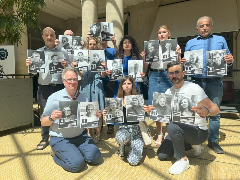 У чэрвені ў Бруселі каля ўваходу ў Residence Palace — будынак, у якім месціцца штаб-кватэра Міжнароднай федэрацыі журналістаў, Еўрапейскай федэрацыі журналістаў і многіх іншых медыяарганізацый і навінавых агенцтваў — з’явіліся партрэты беларускіх журналістаў-палітвязняў.