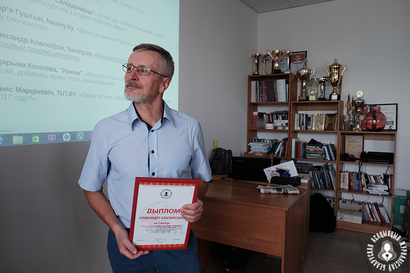 Цырымонія пачалася з хвіліны маўчання ў памяць пра вядомага журналіста, заснавальніка агенцыі БелаПАН Алеся Ліпая, які заўчасна пайшоў з жыцця 23 жніўня.