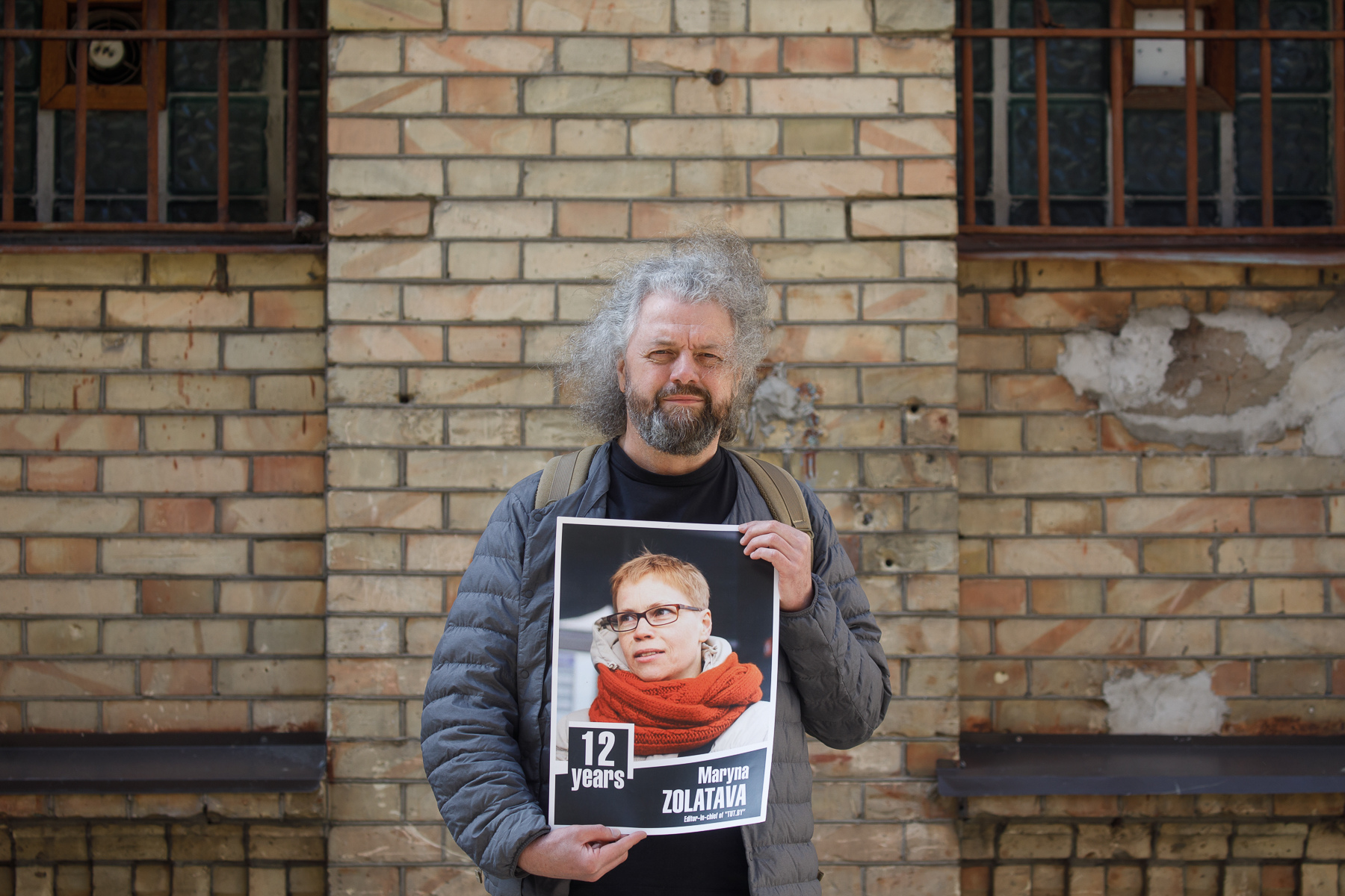 Праваабаронца Леанід Судаленка падчас акцыі салідарнасці з палітзняволенымі журналістамі. Лукішская турма, Вільня, 3 траўня 2024 года. Фота: БАЖ