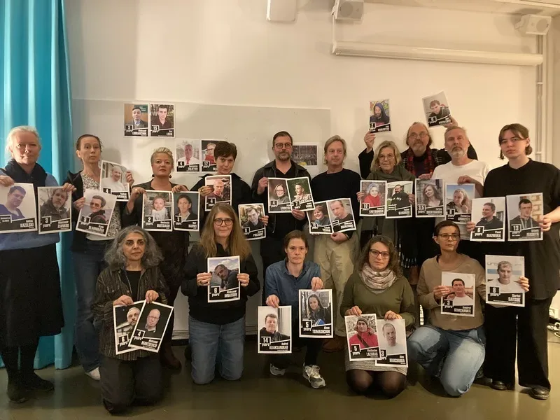 Удзельнікі акцыі салідарнасці «Цэнзура ў Беларусі — забароненыя тэксты» сфатаграфаваліся з партрэтамі зняволеных беларускіх журналістаў. Фота: Оса Олсан