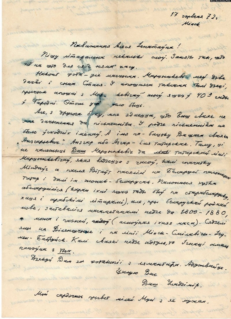 «Смолічу Аркадзю Антонавічу! Перадаю: кашулю, прасьціну, шкарпэткі, чаравікі. Ці патрэбная коўдра? Я здаровая, рыхтуюся да іспытаў. Горача цалую. Шура. 30.06.37»