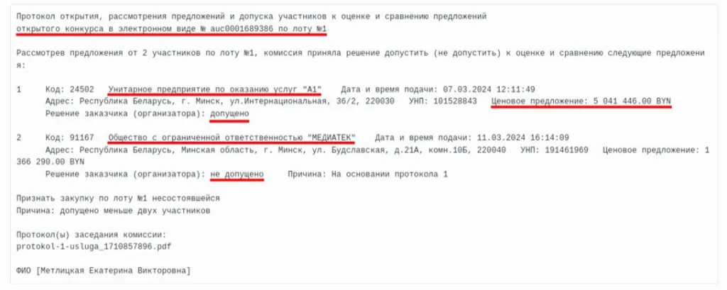 Мяркуючы са звестак на сайце дзяржаўных закупак, у лютым і сакавіку 2024 года агенцтва БЕЛТА ўсё ж паспрабавала правесці адкрытыя конкурсы на паслугу па прадстаўленні сэрвісу відэавяшчання. Як сцвярджаюць «Кіберпартызаны», у іх брала ўдзел і кампанія «А1». Канкурэнцыю склала ТАА «Медыятэк», чыю заяўку камісія па закупцы адхіліла.