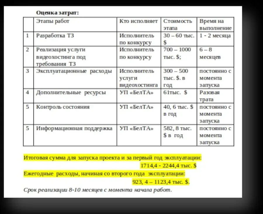 «Так, запуск і абслугоўванне відэахостынгу цягам года прадстаўнікі «А1» папярэдне ацанілі ў 600−700 тысяч даляраў, калі браць гатовае рашэнне на базе праграмнага забяспечання «Вока». Аднак выдаткі ўжо праз месяц абмеркаванняў былі істотна скарэктаваныя ў большы бок. Супрацоўнікі БЕЛТА ацанілі неабходную суму для запуску і эксплуатацыі медыяплатформы ў першы год прыкладна ў 1,5−2 мільёны даляраў, а штогадовыя выдаткі, пачынаючы з другога года — прыкладна ў мільён даляраў», — расказалі хакеры.