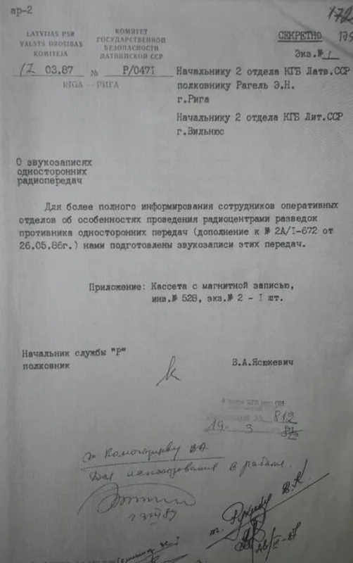 Сомнения в предназначении номерных радиостанций полностью исчезли после окончания холодной войны, когда власти нескольких стран (Польши, Латвии, Швеции) рассекретили и опубликовали информацию об их работе. Так, среди документов КГБ Латвийской ССР, которые в 2019 году оцифровал и опубликовал Национальный архив Латвии, была любопытная секретная докладная записка, подготовленная начальником службы «Р» полковником Владимиром Ясюкевичем. Тот в марте 1987 года информировал свое руководство «об особенностях проведения радиоцентрами разведок противника односторонних передач» на территорию СССР, для чего подготовил звукозаписи этих радиопередач на магнитофонной кассете.