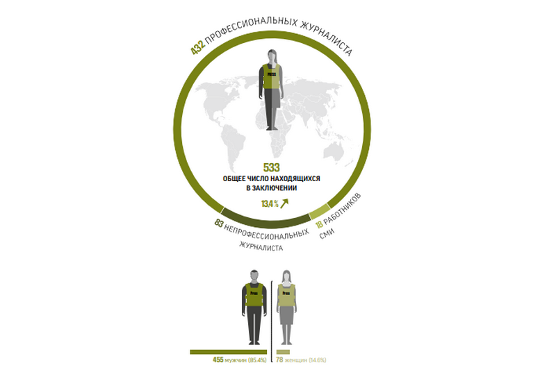Рекорд, установленный в прошлом году, был снова превзойден: по состоянию на первое декабря 2022 года 533 журналиста находились в тюрьме за их профессиональную деятельность, что на 13,4% больше, чем в прошлом году. Никогда ранее организация RSF не фиксировала такого большого числа женщин-журналистов, находящихся в тюрьмах. В настоящее время за решеткой находятся 78 женщин, что почти что на 30% больше, чем годом ранее. Женщины-журналисты сегодня составляют почти 15% от общего числа заключенных, тогда как пять лет назад их было менее 7%.