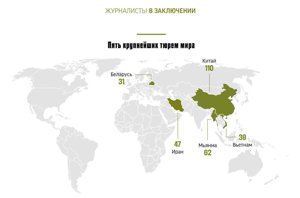 Международная неправительственная организация «Репортеры без границ» представила свой годовой отчет о положении журналистов по всему миру. Беларусь замыкает пятерку стран с наибольшим количеством журналистов за решеткой (31) (по подсчётам БАЖ — 32 представителя медиа, — ред.). Опережают Беларусь лишь Вьетнам (39), Иран (47), Мьянма (62) и Китай (110).