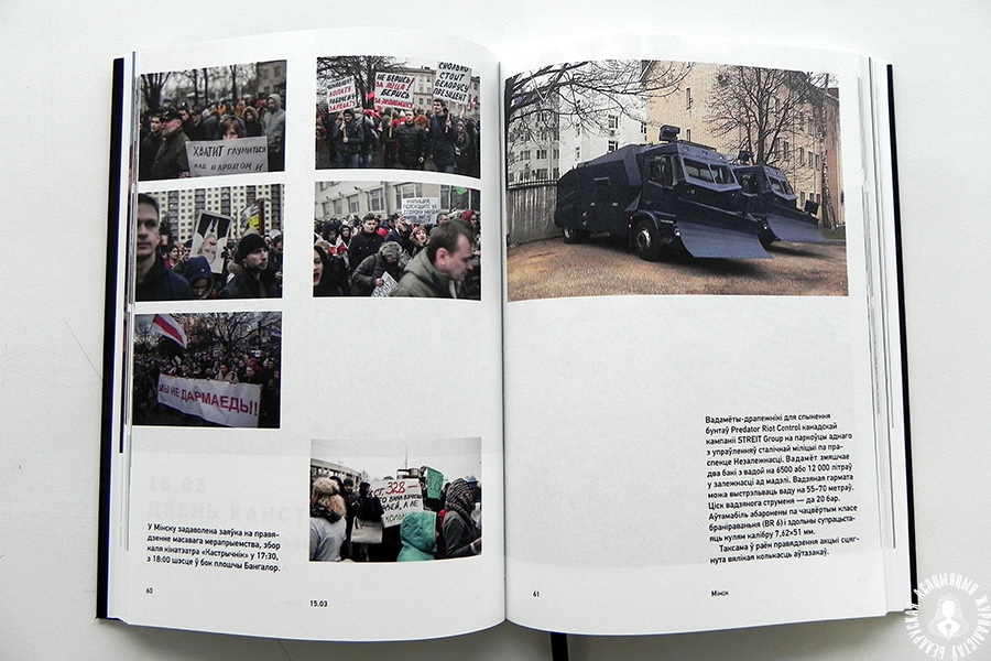 — Напярэдадні 25 сакавіка, а ў фотакнізе багата старонак прысвечана падзеям Дня волі-2017, хацелася б не столькі нагадаць пра рэпрэсіі, разгоны, збіццё, колькі сказаць, што наш выдатны беларускі народ прагне, і варты лепшай долі! Менавіта людзі, грамадзяне, народ. Не чыноўнікі, засядацелі і маўклівыя дэпутаты, а звычайныя беларусы! Мы! — дадае Алесь Бяляцкі.