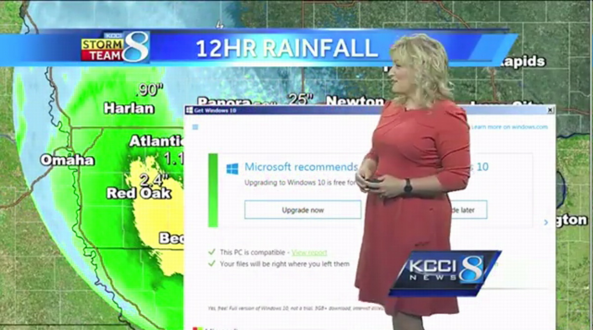 Телеведущая американского телеканала оказалась удивлена, когда в прямом эфире увидела уведомление с призывом установить новую Win­dows. Курьез произошел в эфире канала KCCI 8, который вещает в Айове. Всплывающее окно появилось прямо на табло с картой и заслонило собой почти весь экран.