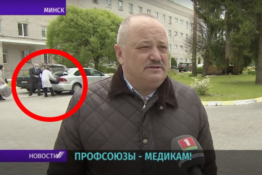 14 мая на канале “Беларусь 1” вышел репортаж о том, как белорусские профсоюзы поддерживают медиков. Председатель Минского областного объединения профсоюзов Виктор Малиновский сам привёз в Минскую ЦРБ средства индивидуальной защиты — дезинфицирующие гели, около трёх тысяч бахил, комбинезоны. Внимание зрителей привлекли кадры, где Малиновский рассказывает о помощи, а на заднем плане тюки с СИЗами… загружаются назад в багажник автомобиля.