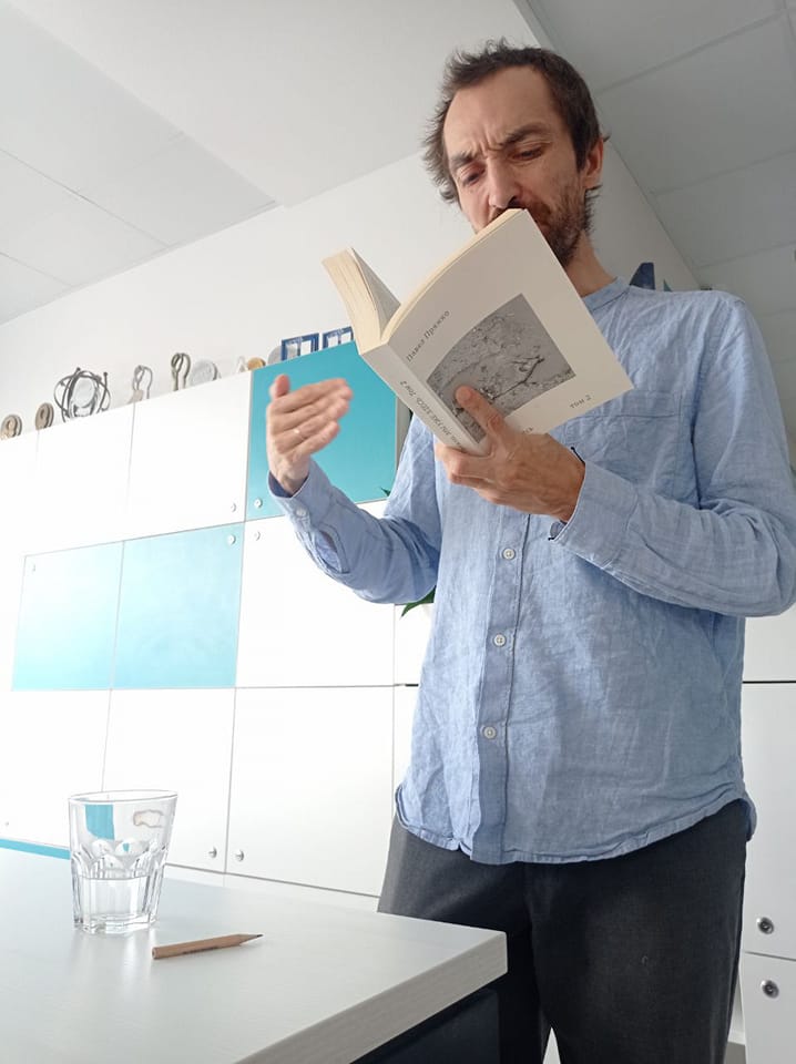 Последняя запись в инстаграм — об эксперименте. Когда Стрельникову пришлось заменить жену в ее литературной группе для подростков. Он подумал, что неправильно быть там литературным учителем и решил провести физический тренинг для письма. Алексей предложил ребятам попробовать, что такое писать в неудобных и непривычных для себя позах. И, что вполне естественно для него, сам все опробовал.