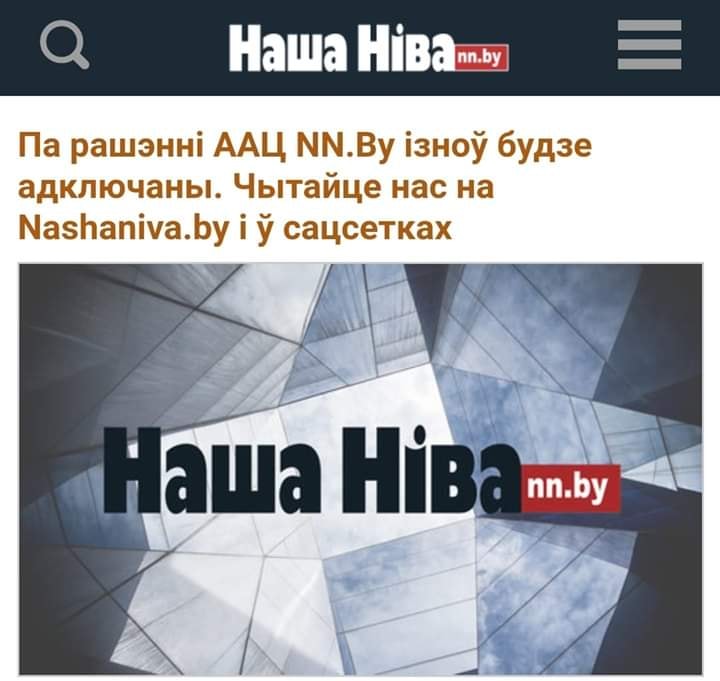 «Па рашэнні ААЦ ізноў адключаны NN.by. Чытайце нас на Nashaniva.by і ў сацсетках», — гаворыцца ў паведамленні.
