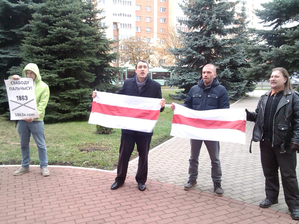 Каля 10 чалавек развярнулі бел-чырвона-белыя сцягі перад будынкам суда і пачалі выкрыкваць лозунгі. Сярод іх Яўген Афнагель, Павел Севярынец, Максім Вінярскі. Міліцыянты не перашкаджаюць акцыі, але чкладаюць пратаколы на яе ўдзельнікаў.
