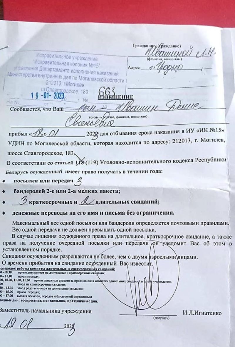 Пра тое, што Дзяніс Івашын змяніў пенітэнцыярную “прыпіску”, ягоныя сваякі даведаліся толькі праз тыдзень напрыканцы мінулага тыдня – пры тым, як вынікае з афіцыйнага ліста, у Магілёў ён прыбыў 18 студзеня, выбыўшы з Гродна днём раней.
