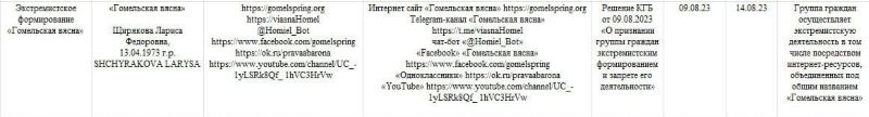 Дарэчы, Facebook-акаўнт «Гомельская вясна» на падставе рашэння Ленінскага суда Брэста яшчэ 8 чэрвеня 2023 быў унесены ў Рэспубліканскі спіс экстрэмісцкіх матэрыялаў.
