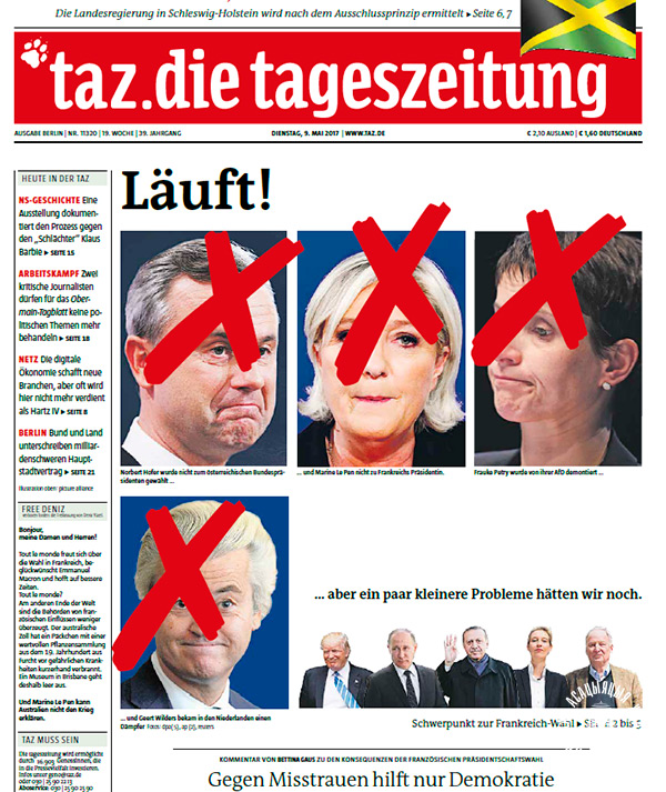 Встреча с журналистом Андреасом Руттенауэром отметилась также тем, что эмоциональную претензию к газете высказал представитель России. После проигрыша Марин Ле Пен на президентских выборах во Франции издание вышло вот с такой передовицей.