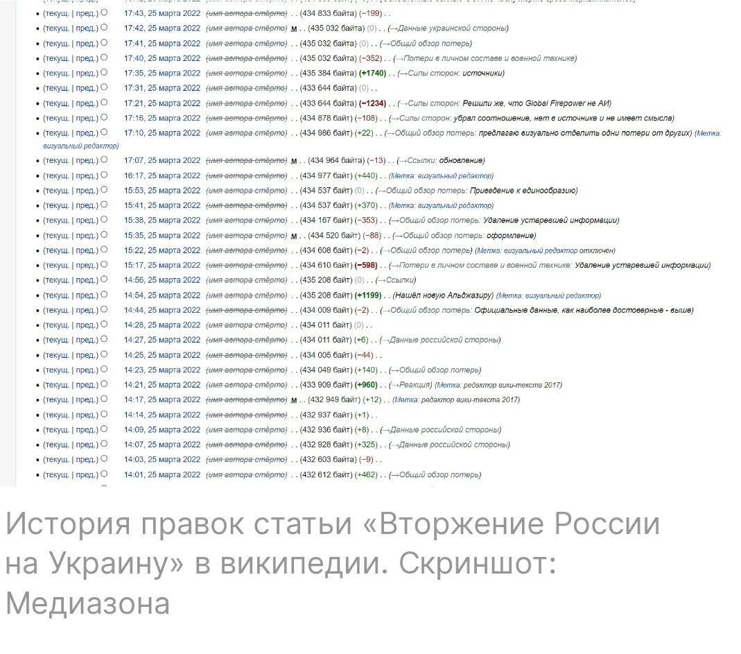 — Если открыть историю статей, например, про вторжение, мы увидим, что администраторы периодически заходят и с помощью специальной опции, доступной для них, скрывают имя автора, кто делал конкретную правку. Таким образом они пытаются усложнить жизнь тем, кто пытается дальше следить за историей правок и анализировать, кто что пишет. Сообщество русской википедии решило, что все это небезопасно и неизвестно, кто будет следующий жертвой, — объясняет Грузнов.