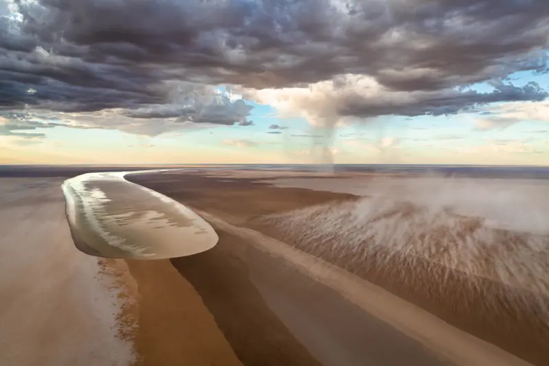 Австралийский фотограф Брэд Лью запечатлел наводнение, обрушивающееся на озеро Кати-Танда-Лейк-Эйр в Австралии. Снимая с вертолета при сильном ветре, он задокументировал это природное явление, случающееся раз в десятилетие.